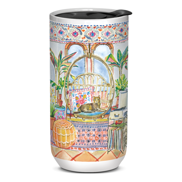 Tasteful, refined, and living the life of luxury these pretty kitties are ready to join you anytime. Drinks stay cold or hot in these ceramic double-walled travel mugs with removable plastic sipping lids.