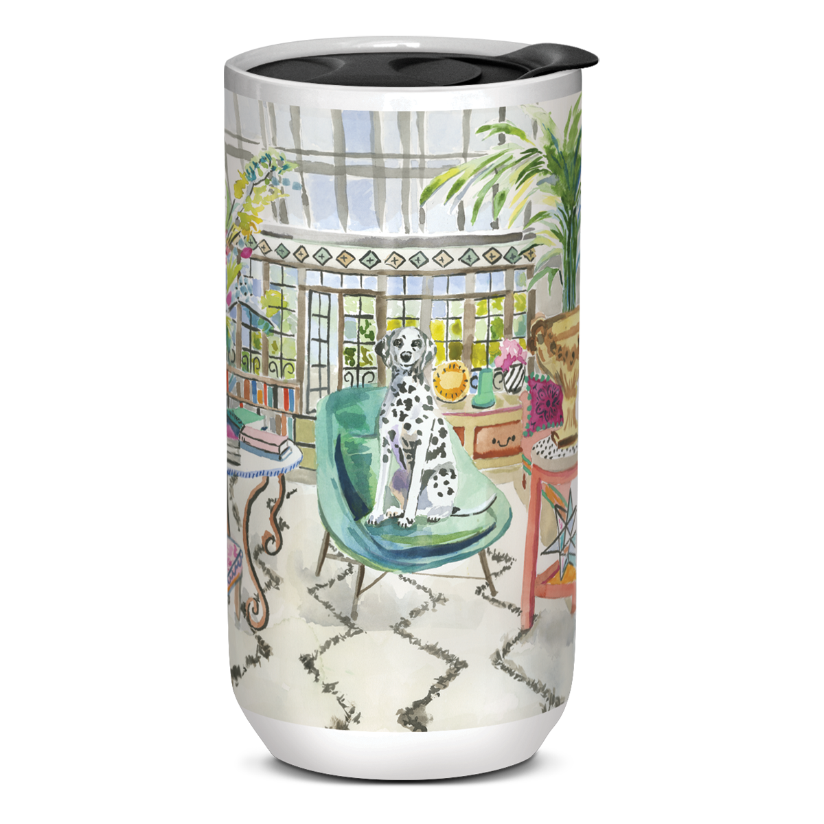 Perfect for lounging on the veranda with a vente, or iced tea on the terrace. Drinks stay cold or hot in these ceramic double-walled travel mugs with removable plastic sipping lids.