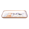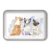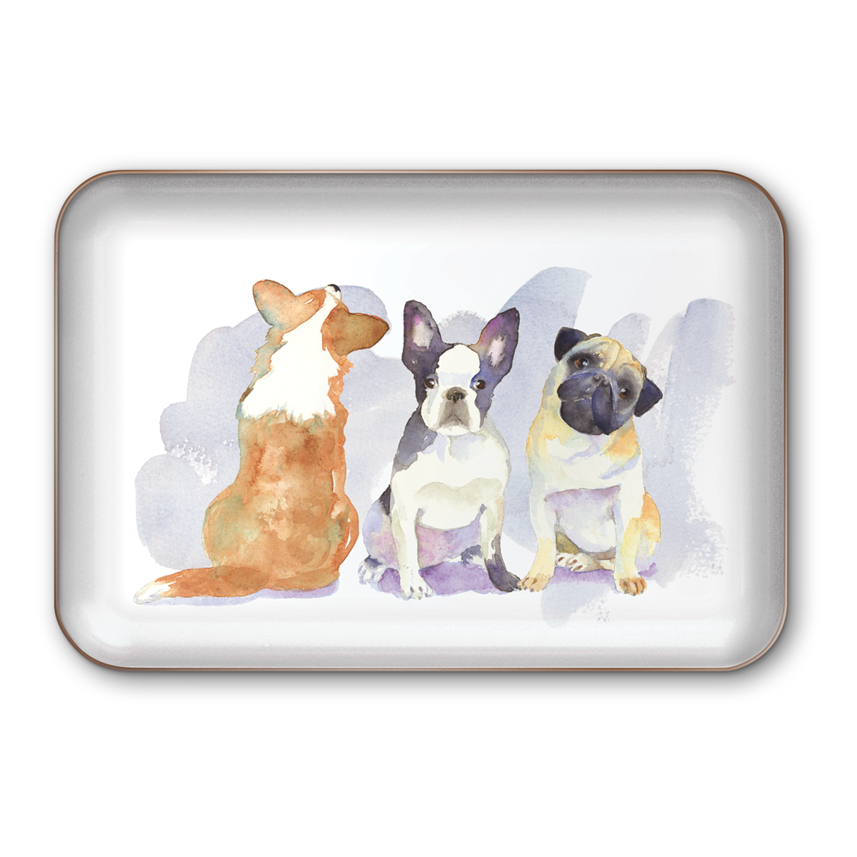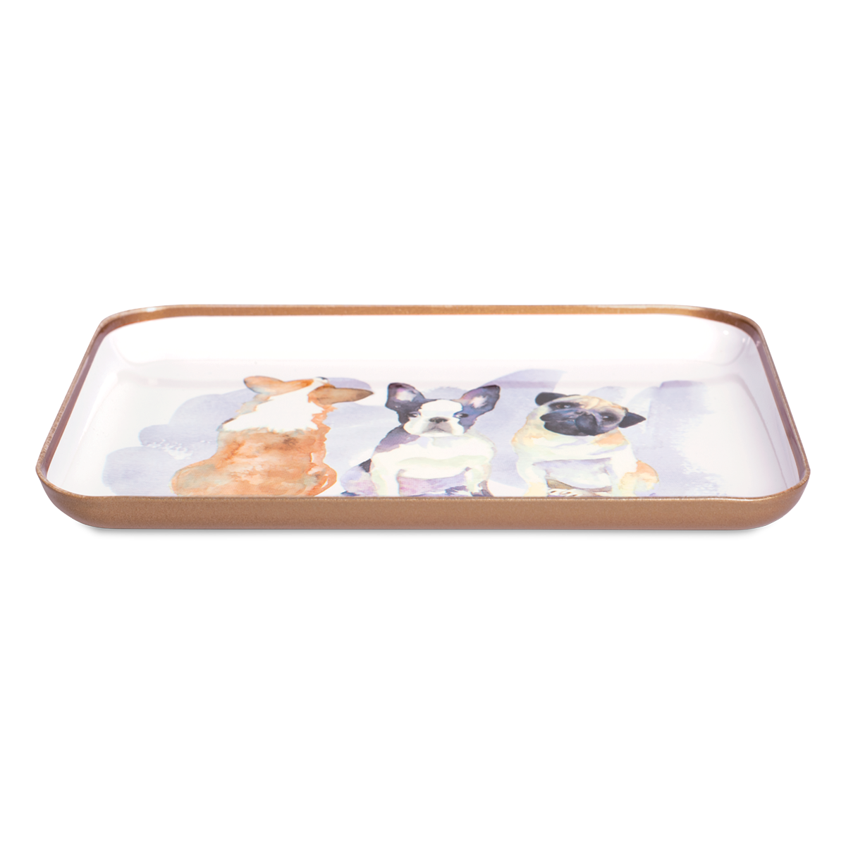 Dress up your makeup table, bathroom countertop, or nightstand with these decorative trays featuring soft watercolor art imagery of darling dogs. Glossy printed tray is backed with gold metallic base. For decoration only, not food safe.