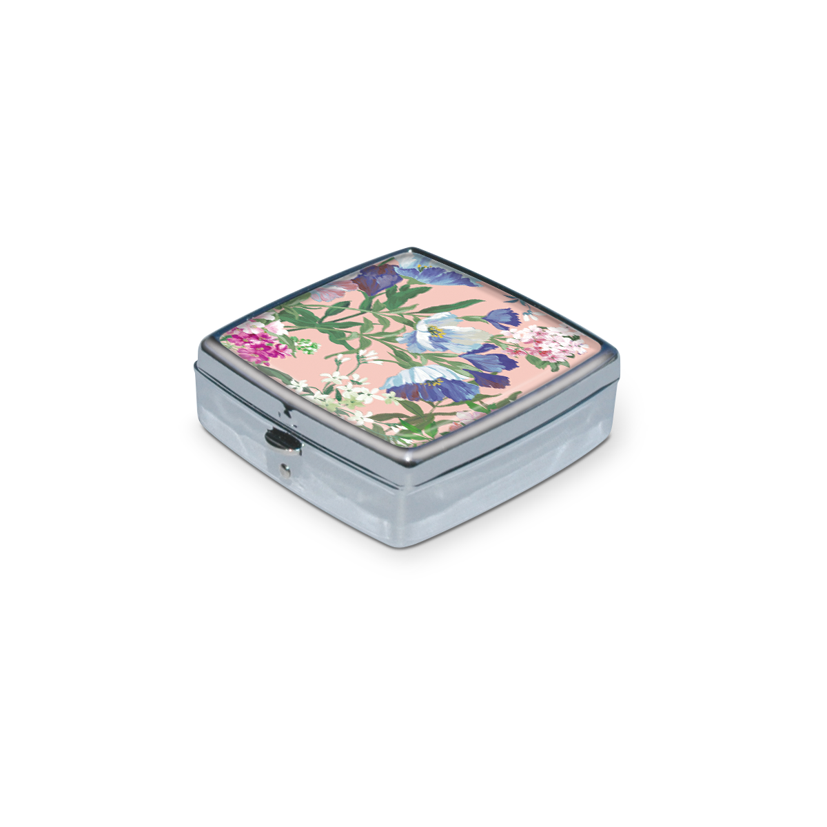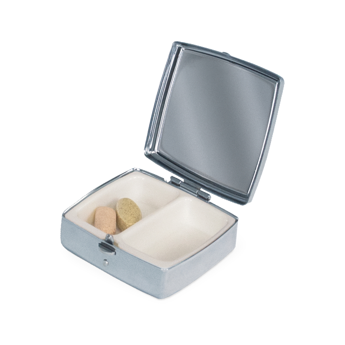 Just two inches square, our chrome-plated pill boxes keep your meds handy, but can also contain all those little things you need in a pinch—buttons, paperclips, earrings, etc. Plastic lined interior has two compartments. Includes, press-release latch closure.