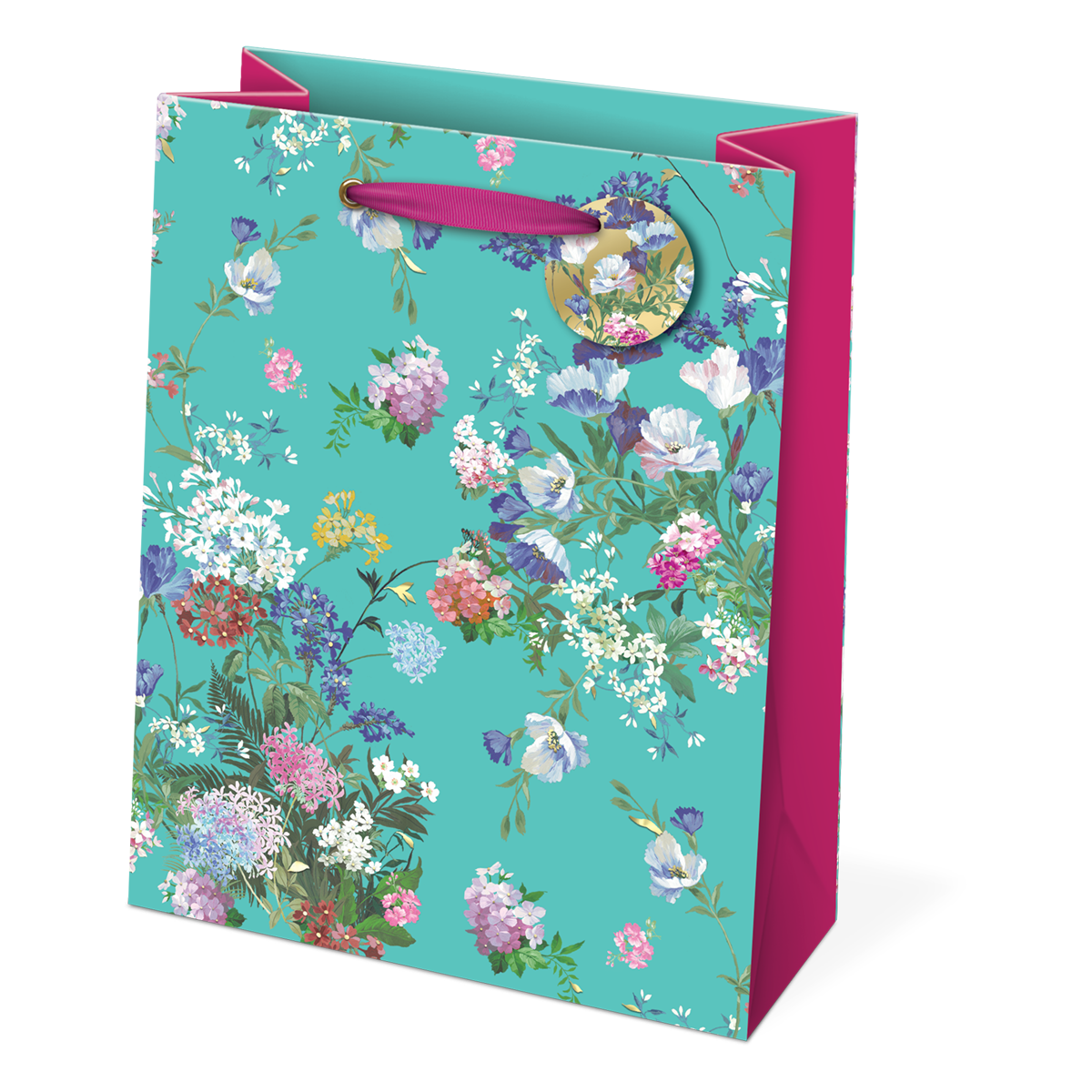 Each decorative Gift bag features a burst of beautiful blooms. Fancy ribbon handles, gold foil accents and coordinating die-cut hangtags.