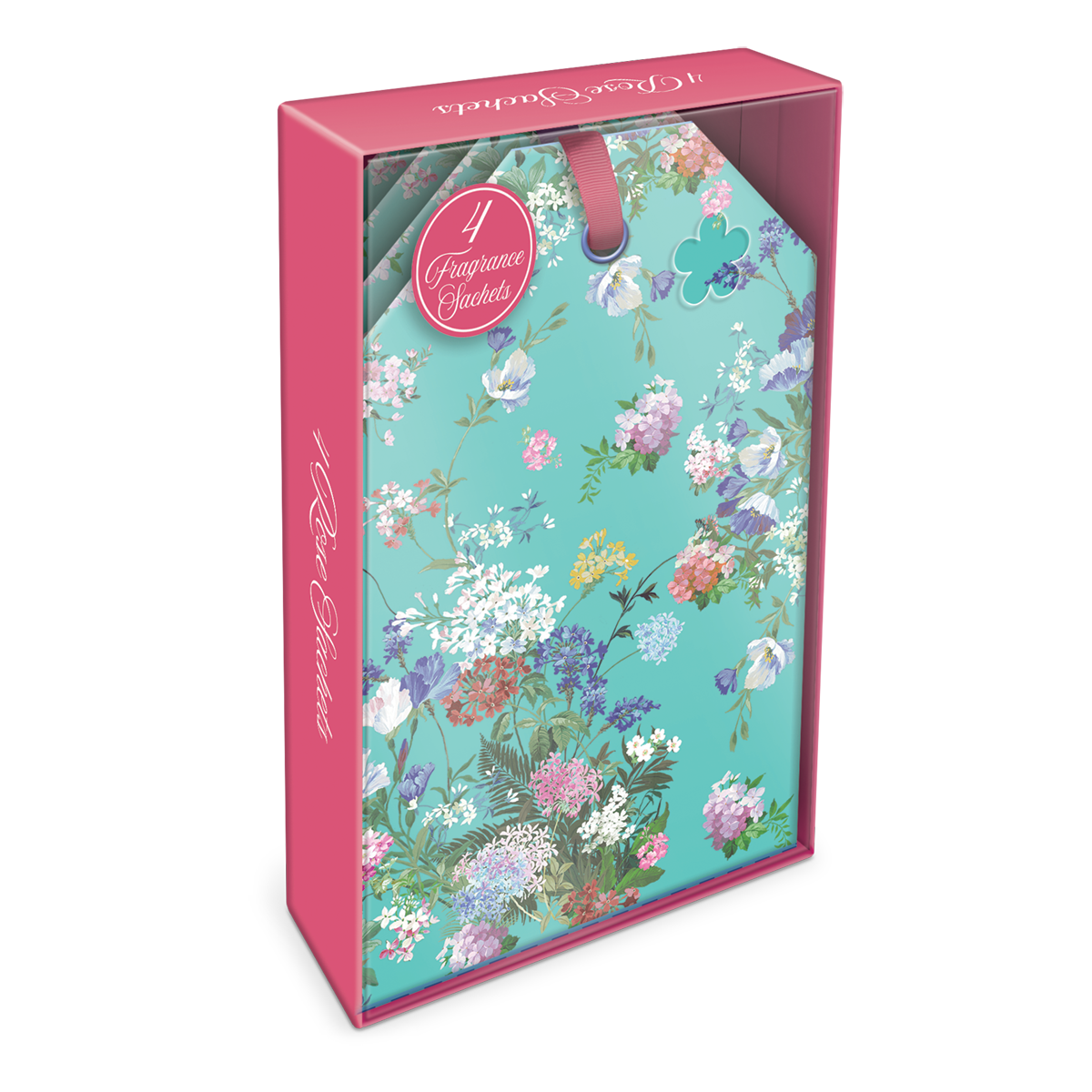 If you like the look of our fancy floral sachets, you’ll love the pretty flower scents. Slip a little fragrance into drawers, wardrobes, or suitcases to freshen enclosed spaces. Each sachet hangs with ribbon bow threaded through metal grommet. Perfectly boxed for Gifting as a set of four.