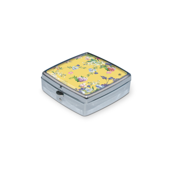 Just two inches square, our chrome-plated pill boxes keep your meds handy, but can also contain all those little things you need in a pinch—buttons, paperclips, earrings, etc. Plastic lined interior has two compartments. Includes, press-release latch closure.