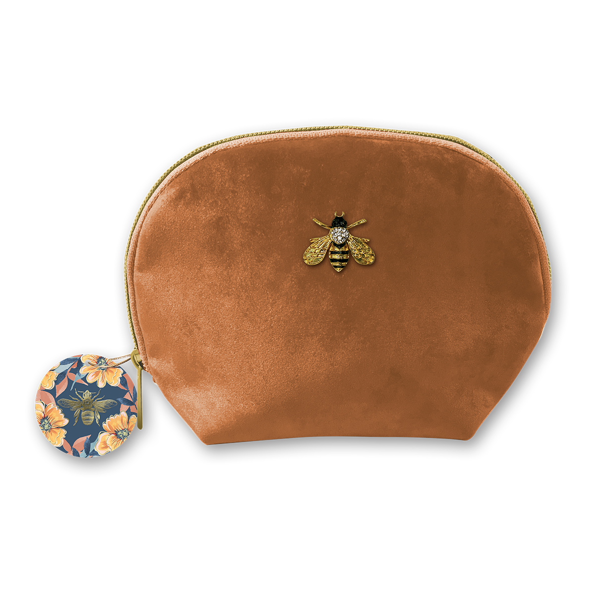 The soft crush of velvet puts these luxe zippered bags a cut above. Features gold foiled zip pull and shimmering jeweled insect brooch.