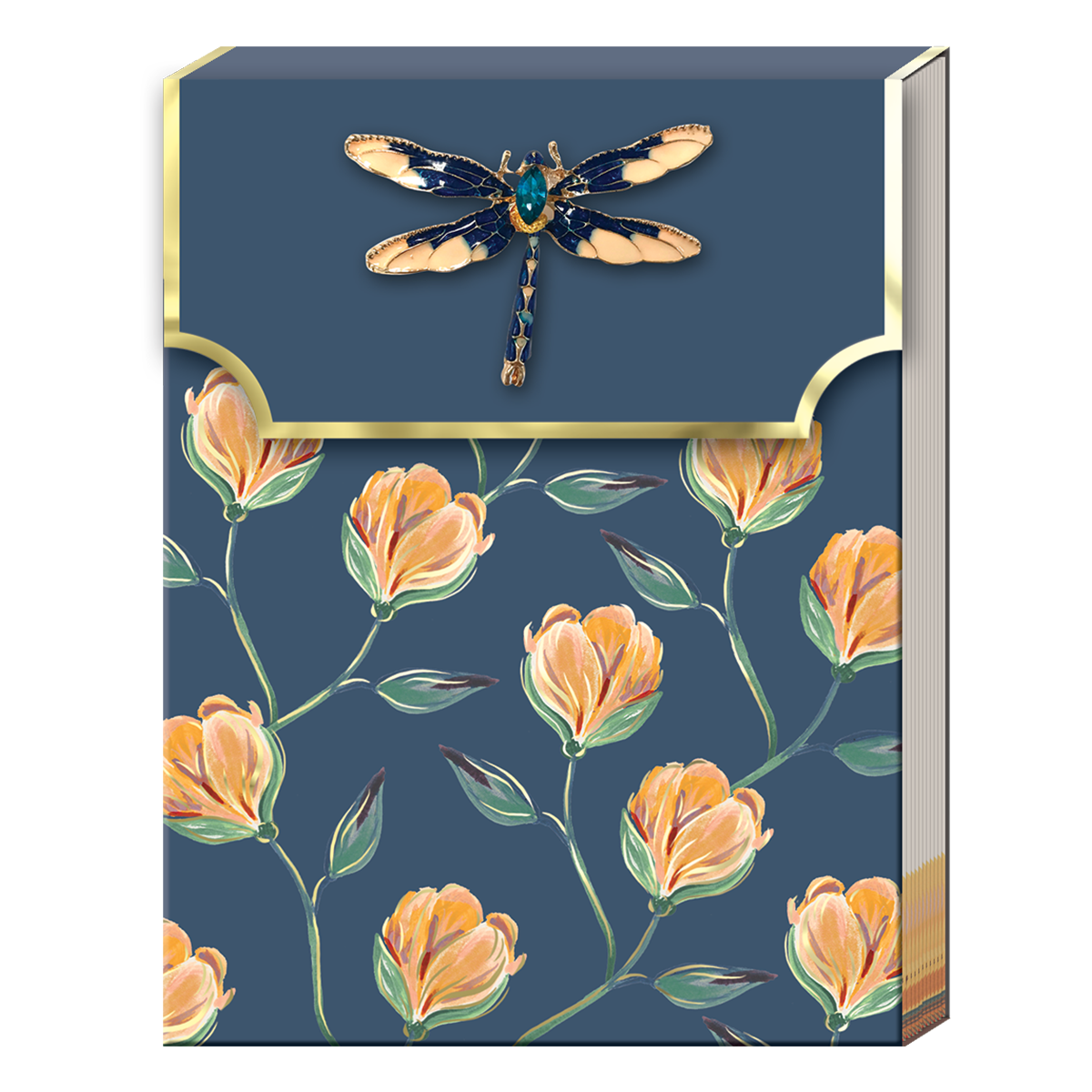 Our jeweled brooch pads are taking flight. Inspiring insects are bedecked with jewels on the magnetic flap closure. Inside, 75 printed color pages have border art elements from the cover.