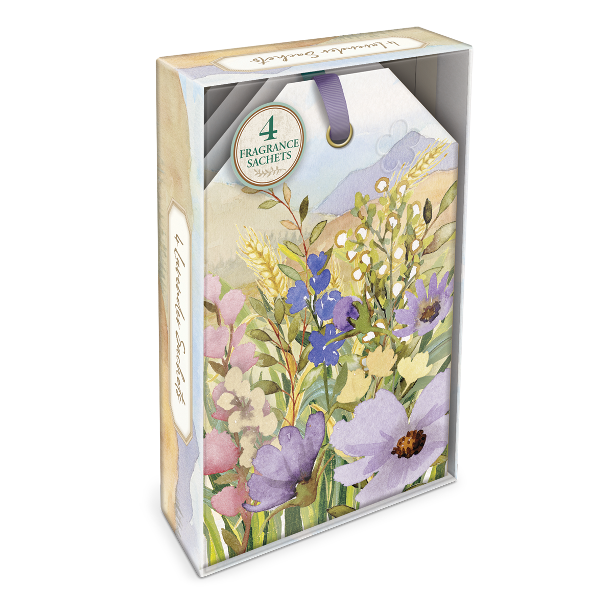 Place a pack of our pretty sachet fragrances into spaces like armoires, dressers or suitcases that need a little freshening. Each sachet hangs with ribbon bow threaded through metal grommet. Perfectly boxed for Gifting as a set of four.