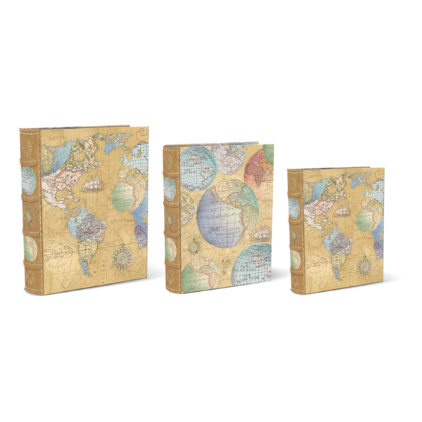 Let these intricate and detailed old-world maps and globes inspire you. Stackable storage boxes can be used for travel memorabilia, journals, and keepsakes. Three useful sizes of nesting boxes in the set.