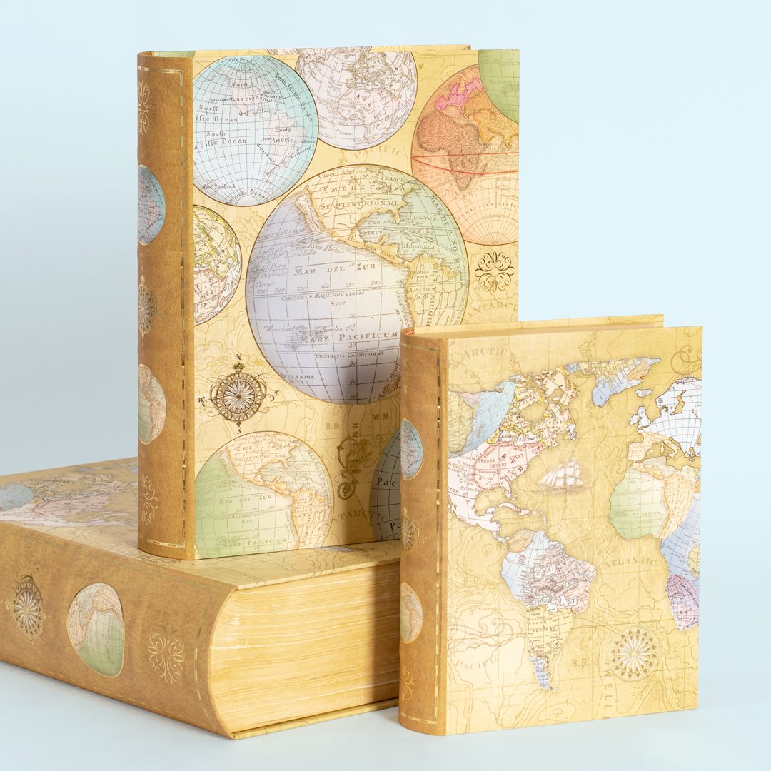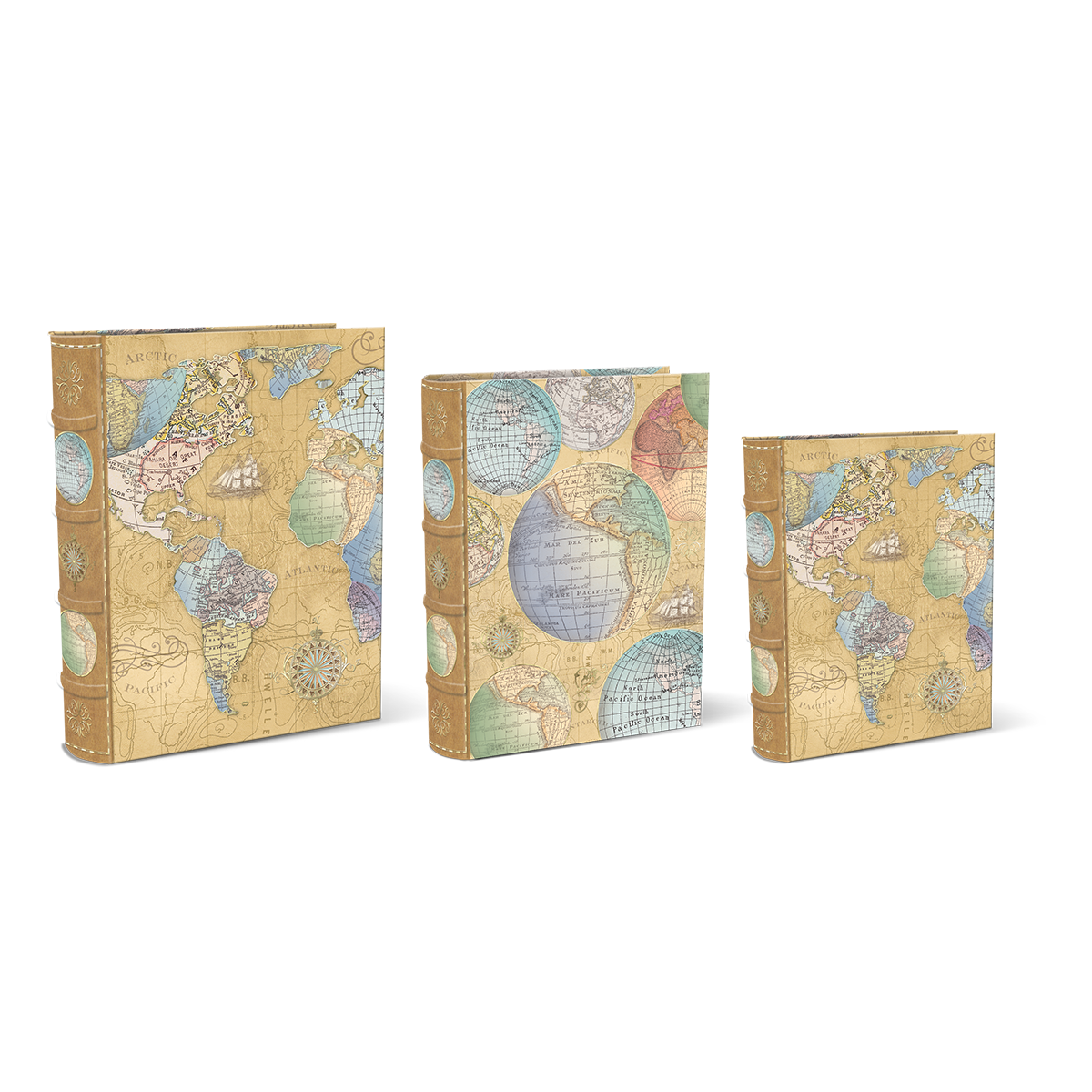 Let these intricate and detailed old-world maps and globes inspire you. Stackable storage boxes can be used for travel memorabilia, journals, and keepsakes. Three useful sizes of nesting boxes in the set.