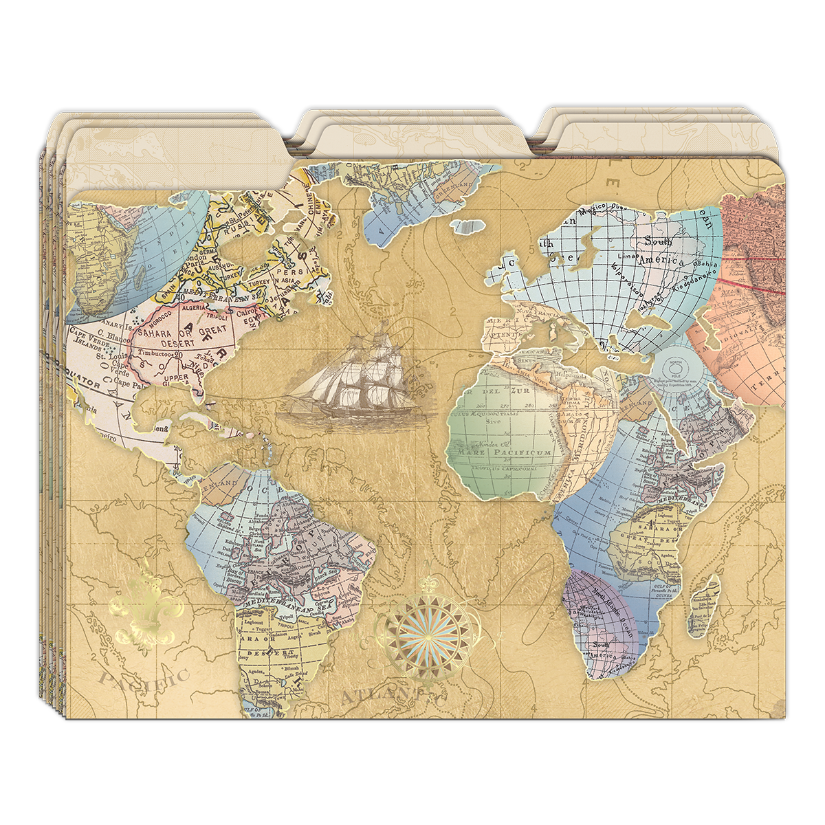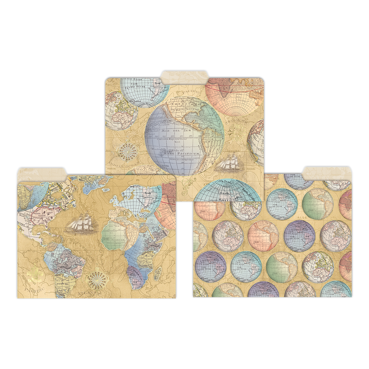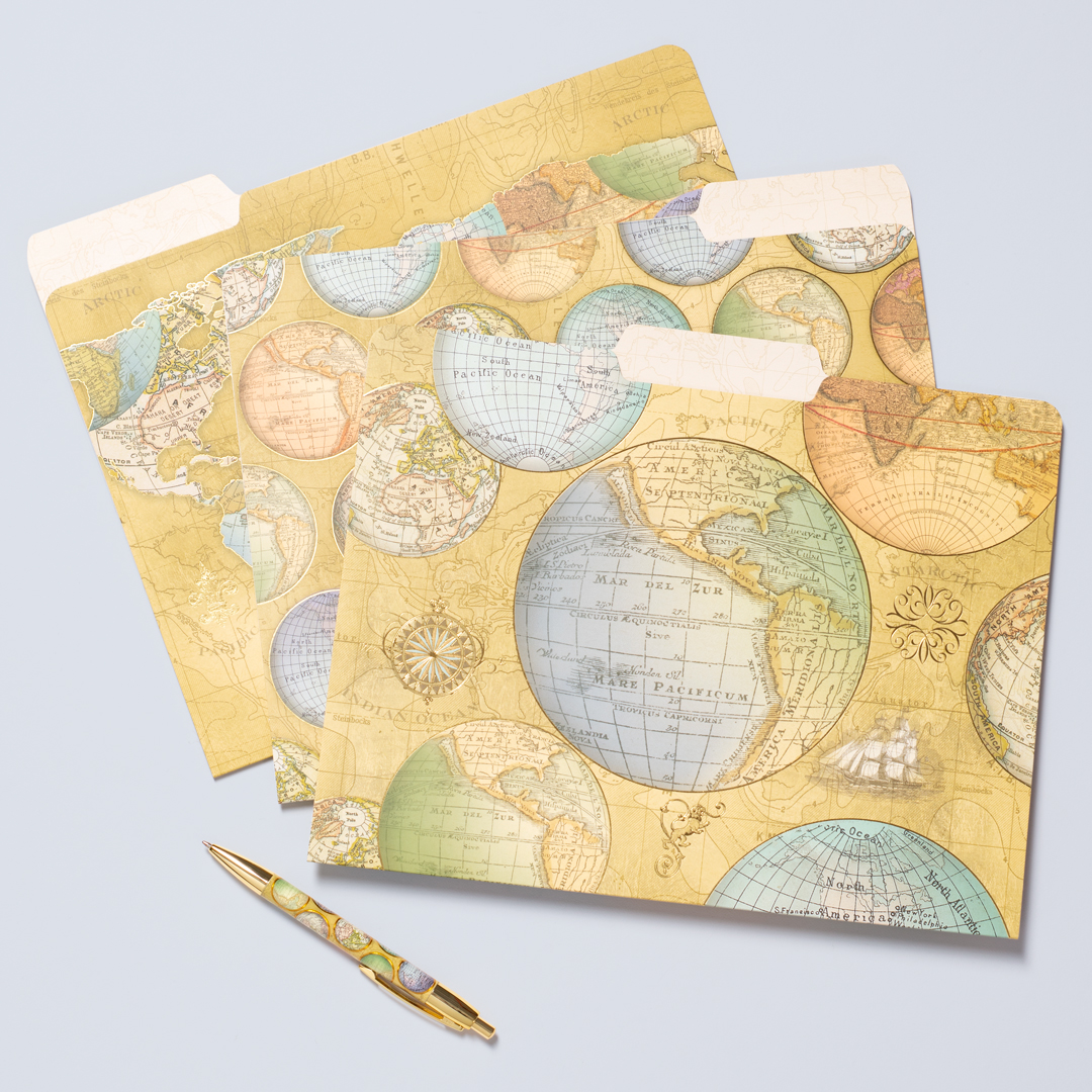 Receipts, invoices, important documents? Easily organize your files with this nine-piece file folder set with three distinct globe and map designs.