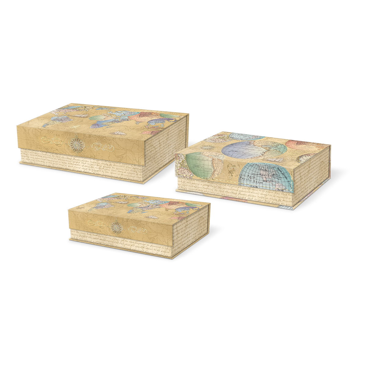 A place for all your favorite things. Distant lands, ancient oceans, and vintage text with swirls of gold embellishment cover these multi-use storage boxes with magnetic flap closure.