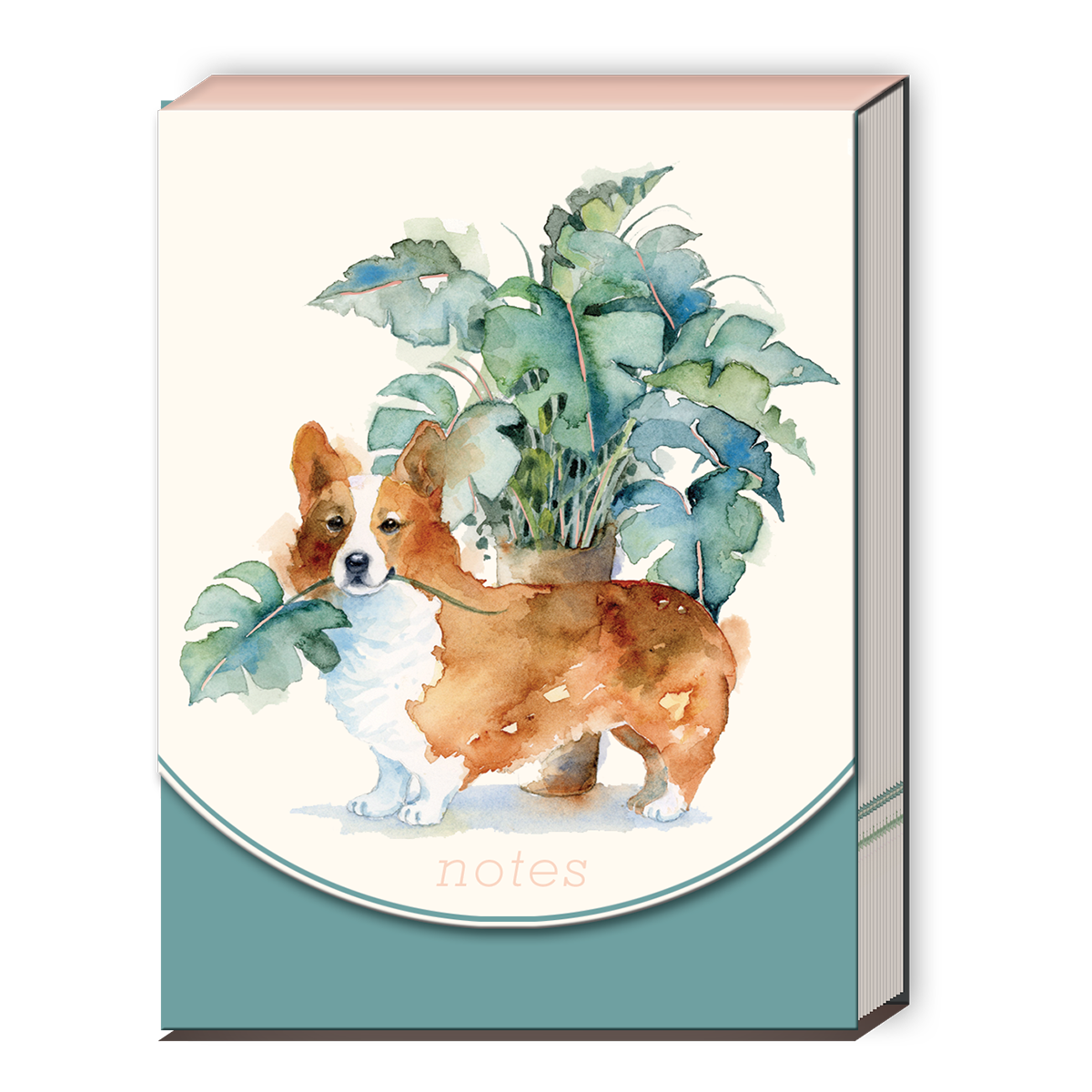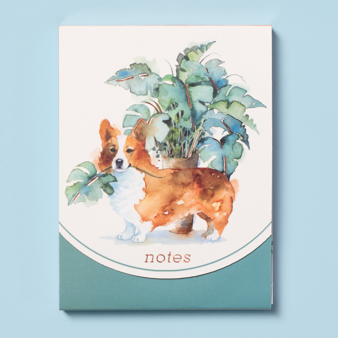 Pint-size pooches in plants. What more can you ask for in a handy pocket-size notebook that can fit easily in your pocket or purse. 75 full color printed lined sheets with tiny corner border art on every page. Cover features rose gold foil embellishments and a magnetic flap closure.