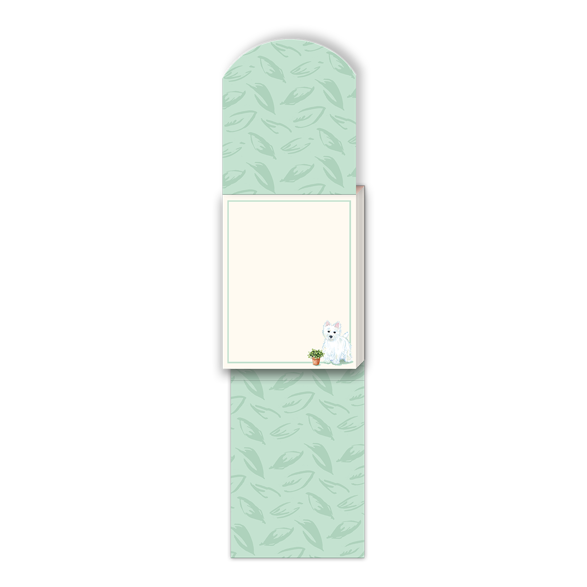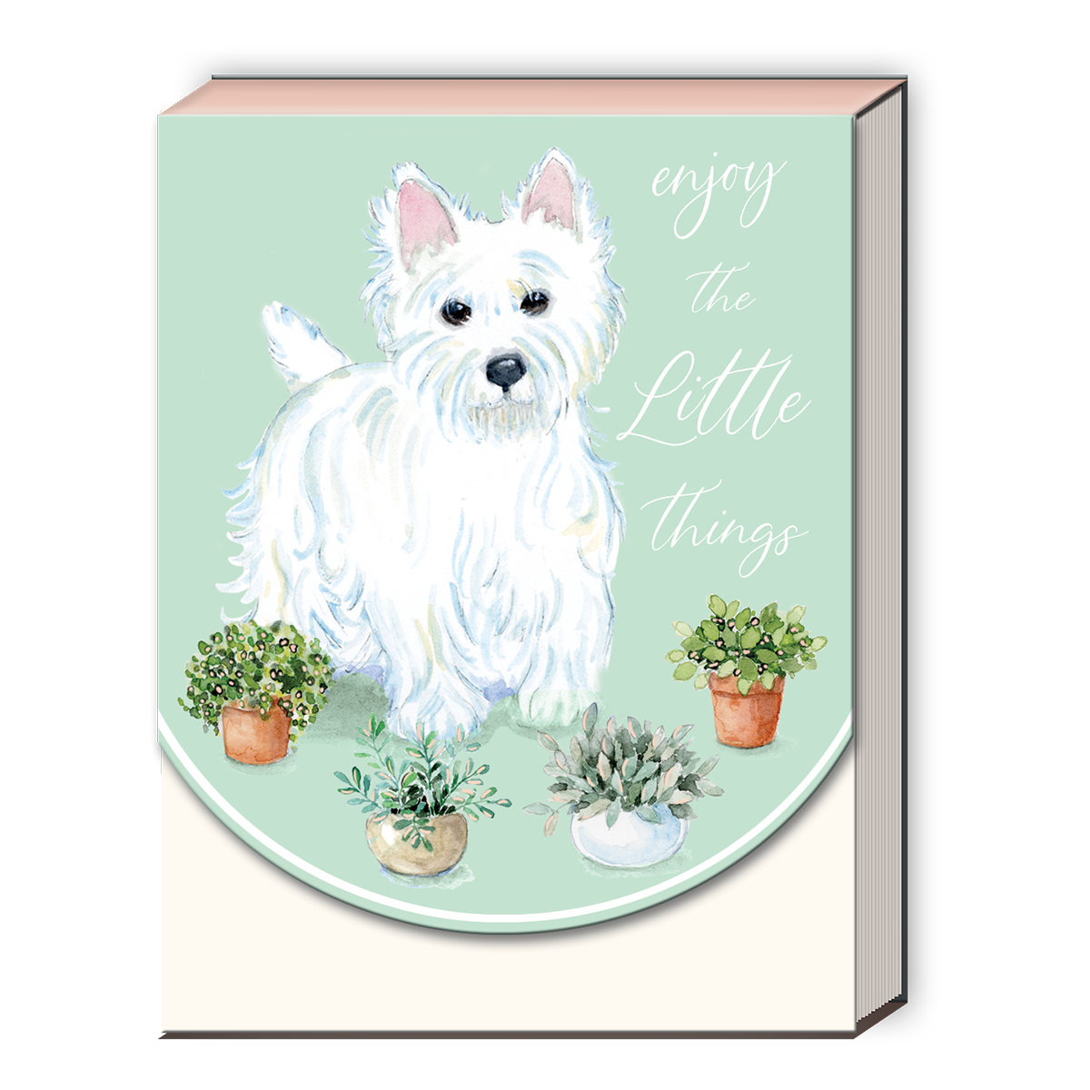 Pint-size pooches in plants. What more can you ask for in a handy pocket-size notebook that can fit easily in your pocket or purse. 75 full color printed lined sheets with tiny corner border art on every page. Cover features rose gold foil embellishments and a magnetic flap closure.