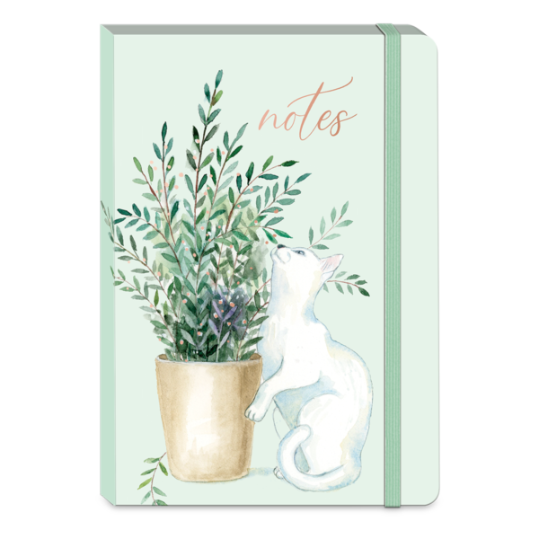 Pretty kitties sitting in potted plants. Look familiar? Great gift for the green thumb pet lover you know. Cover art is accented with rose gold foil. 200 full color lined pages inside feature fun little border art elements. Elastic bungee closure keeps pages neat and tidy.