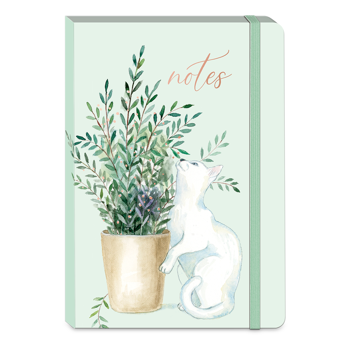 Pretty kitties sitting in potted plants. Look familiar? Great gift for the green thumb pet lover you know. Cover art is accented with rose gold foil. 200 full color lined pages inside feature fun little border art elements. Elastic bungee closure keeps pages neat and tidy.