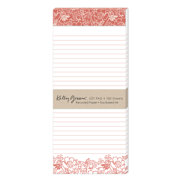 Each pad features pretty patterns on full color printed header and lined sheets that feature artwork elements on each page. Hang one of these magnetic-backed list pads near your busiest workspaces. 100 tear-off sheets printed with soy-based ink on recycled paper.