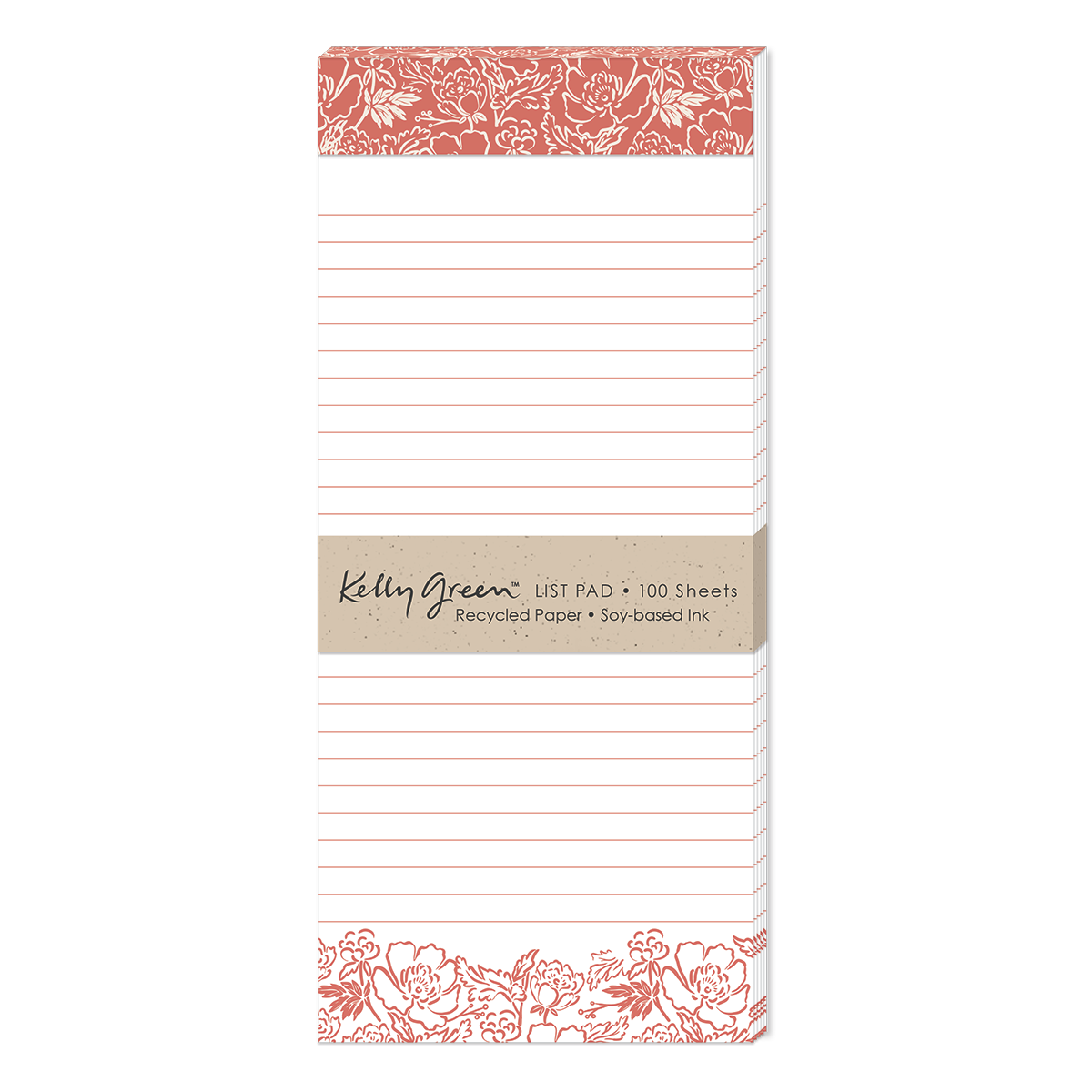 Each pad features pretty patterns on full color printed header and lined sheets that feature artwork elements on each page. Hang one of these magnetic-backed list pads near your busiest workspaces. 100 tear-off sheets printed with soy-based ink on recycled paper.