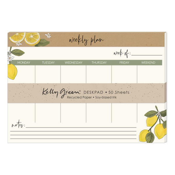 Undated weekly planner pad has a column for each weekday, and one for weekends. Lined space for notes at the bottom of every page, and borders feature fanciful fruits. 50 pages of recycled brown kraft paper printed with soy ink means there are plenty of sheets to get you through the year.