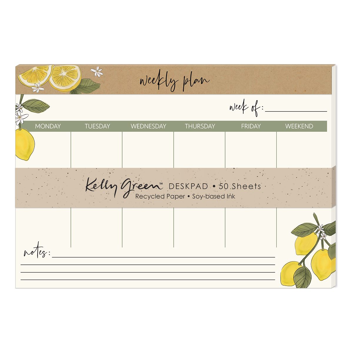 Undated weekly planner pad has a column for each weekday, and one for weekends. Lined space for notes at the bottom of every page, and borders feature fanciful fruits. 50 pages of recycled brown kraft paper printed with soy ink means there are plenty of sheets to get you through the year.
