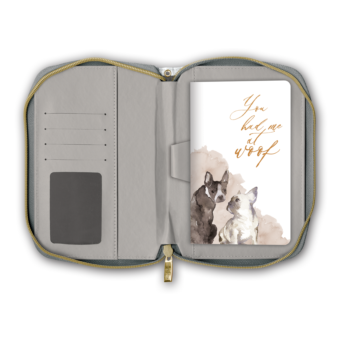 Soft watercolor art captures the loving looks of our pets on this handy faux leather zip-closure journal. Room for more than just the written word: Space for cards and cash, your ID, pen and of course a compact, removable 80-page lined journal. Easy carry with wrist loop.