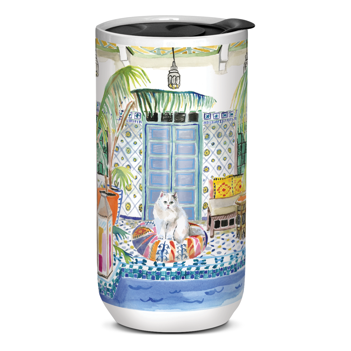 Tasteful, refined, and living the life of luxury these pretty kitties are ready to join you anytime. Drinks stay cold or hot in these ceramic double-walled travel mugs with removable plastic sipping lids.