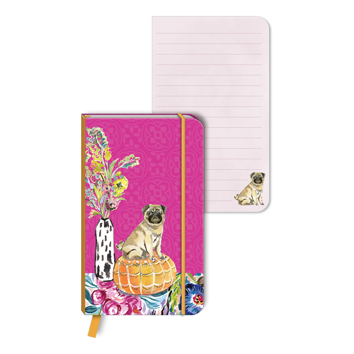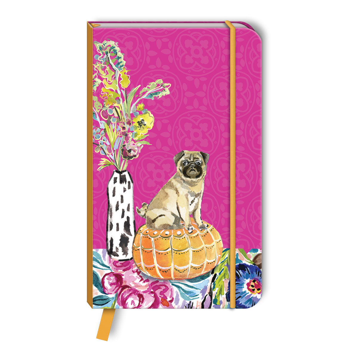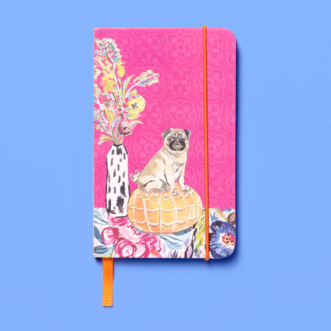 contained in faux leather cover with foil accents. Ribbon bookmark and elastic bungee closure.