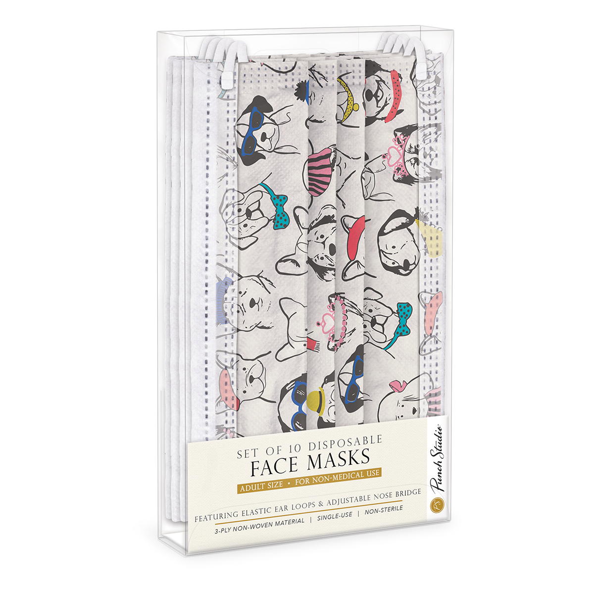 Proclaim your love of pets with one of these disposable masks featuring your favorite animals in playful patterns. Ten masks in a pack, with three-ply non-woven fabric, adjustable pinch nose band and elastic ear loops.