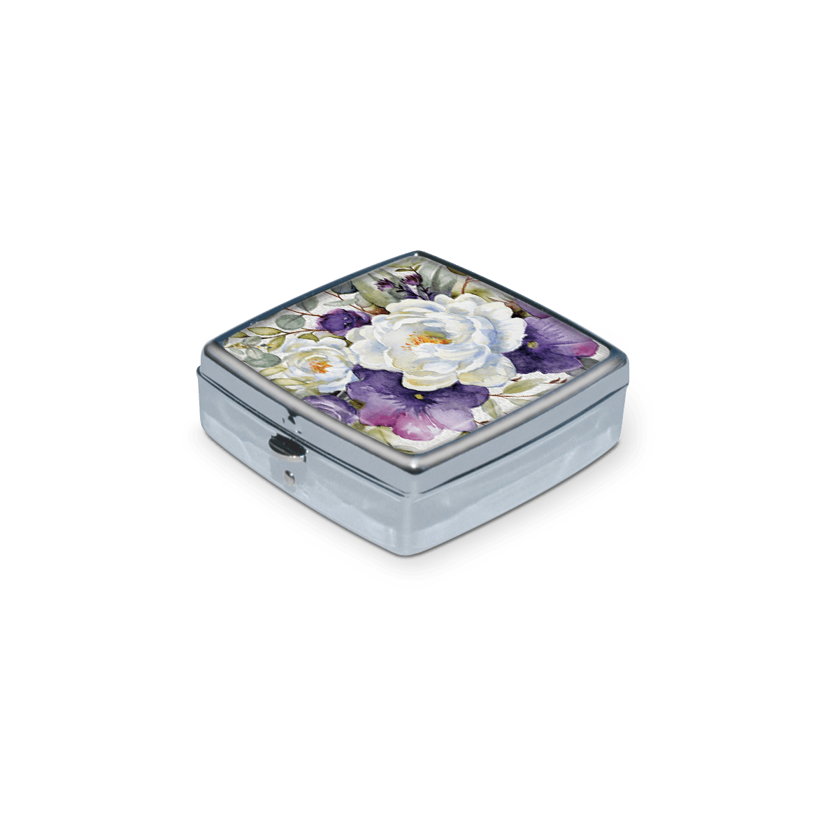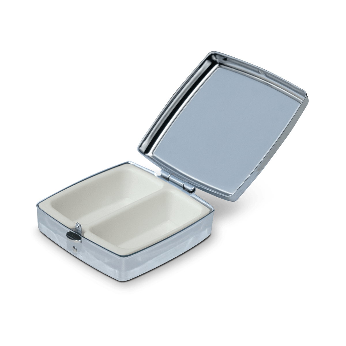 Just two inches square, our chrome-plated pill boxes keep your meds handy, but can also contain all those little things you need in a pinch—buttons, paperclips, earrings, etc. Plastic lined interior has two compartments. Includes, press-release latch closure.