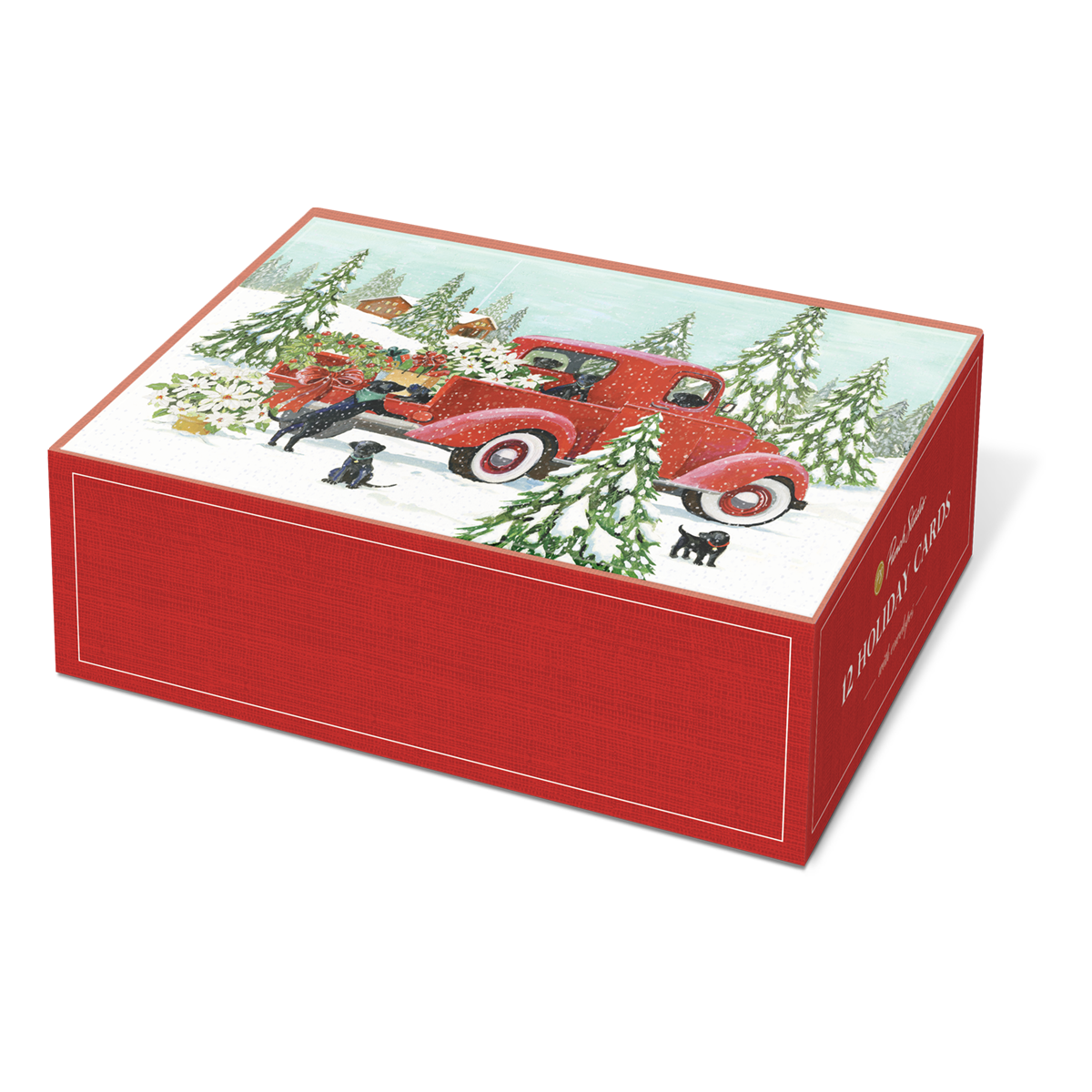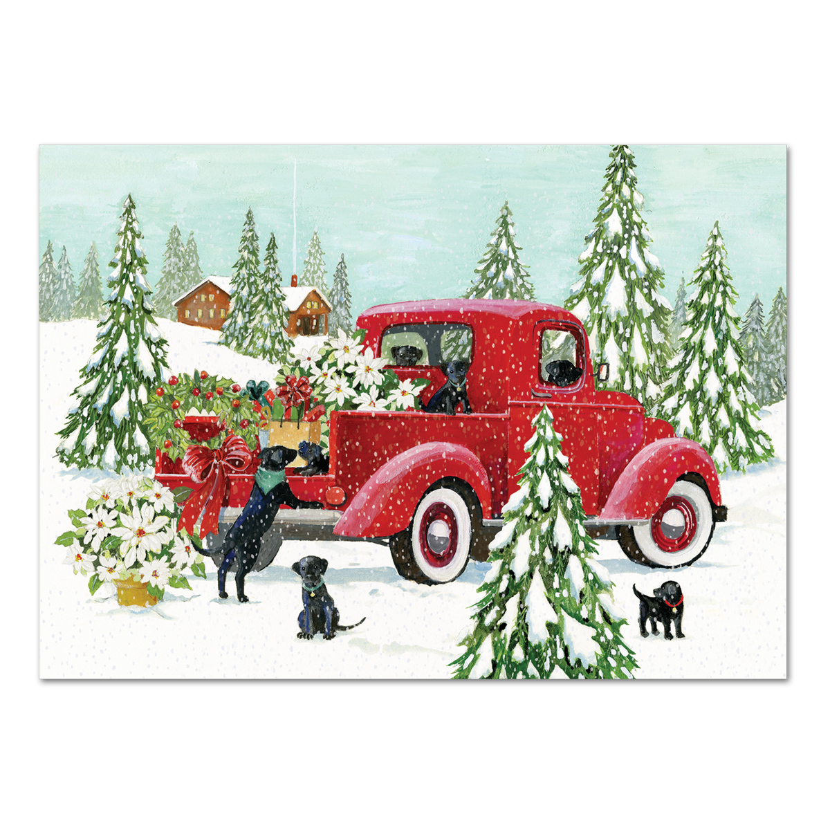 These cards are beautiful. I just finished signing and addressing them to send to everyone on my list. I like the simple message, “Merry Christmas” because it allows me to add my own personal greeting too. I am partial to black puppies and red trucks and this scene shows them in a sparkly snowy wonderland!