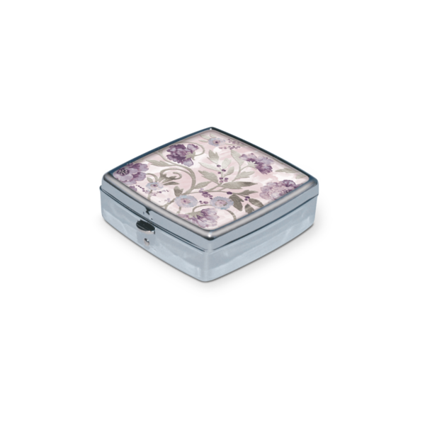 Just two inches square, our chrome-plated pill boxes keep your meds handy, but can also contain all those little things you need in a pinch—buttons, paperclips, earrings, etc. Plastic lined interior has two compartments. Includes, press-release latch closure.