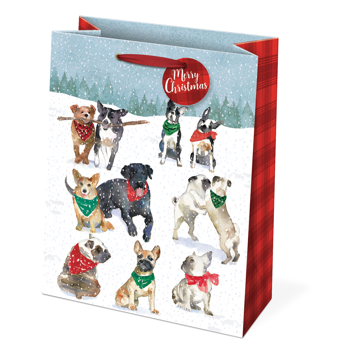 Pups in winter clothing play together on this holiday gift bag that is sure to bring smiles to the lucky recipient.