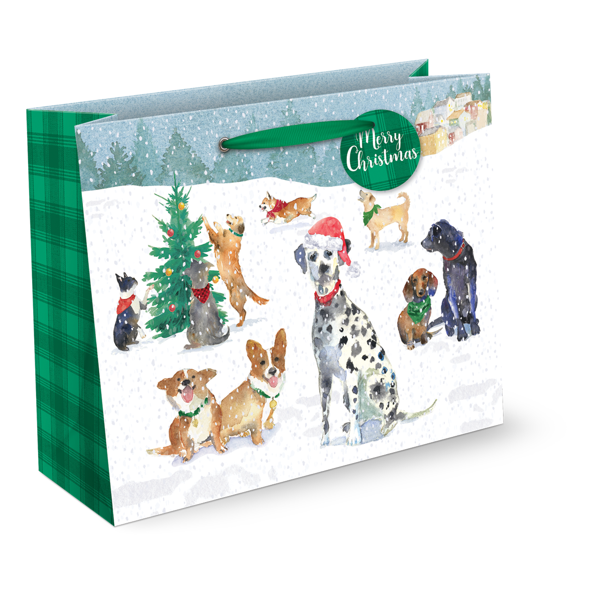 Pups in winter clothing play together on this holiday gift bag that is sure to bring smiles to the lucky recipient.