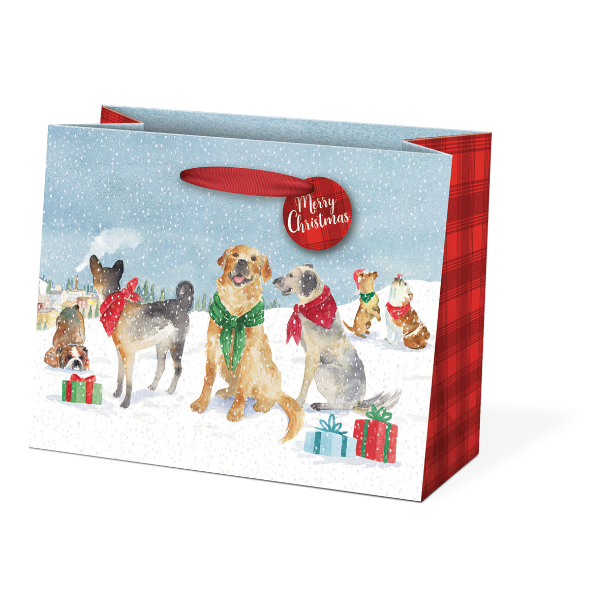 Pups in winter clothing play together on this holiday gift bag that is sure to bring smiles to the lucky recipient.