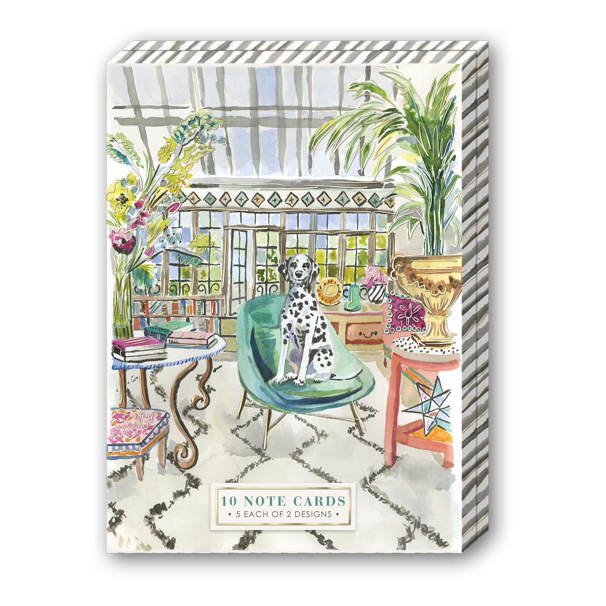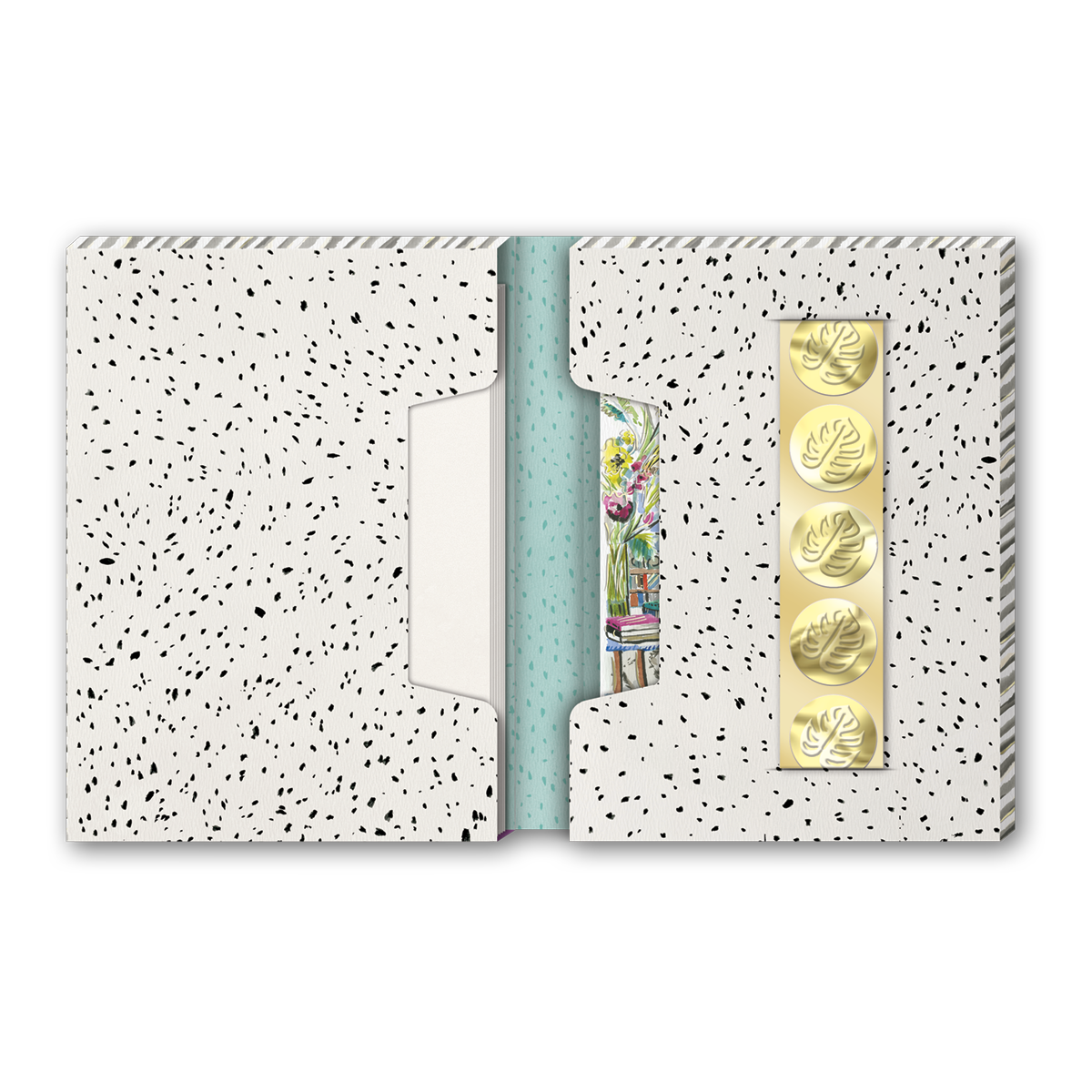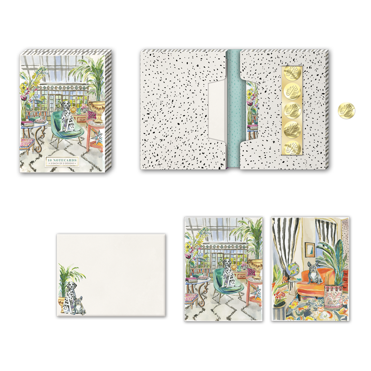 Open this glittery gold-foiled box pouch and find ten carefully kept blank cards in two different dog designs with coordinating envelopes conveniently tucked inside. Features gold foil envelope seals as a fancy finishing touch.