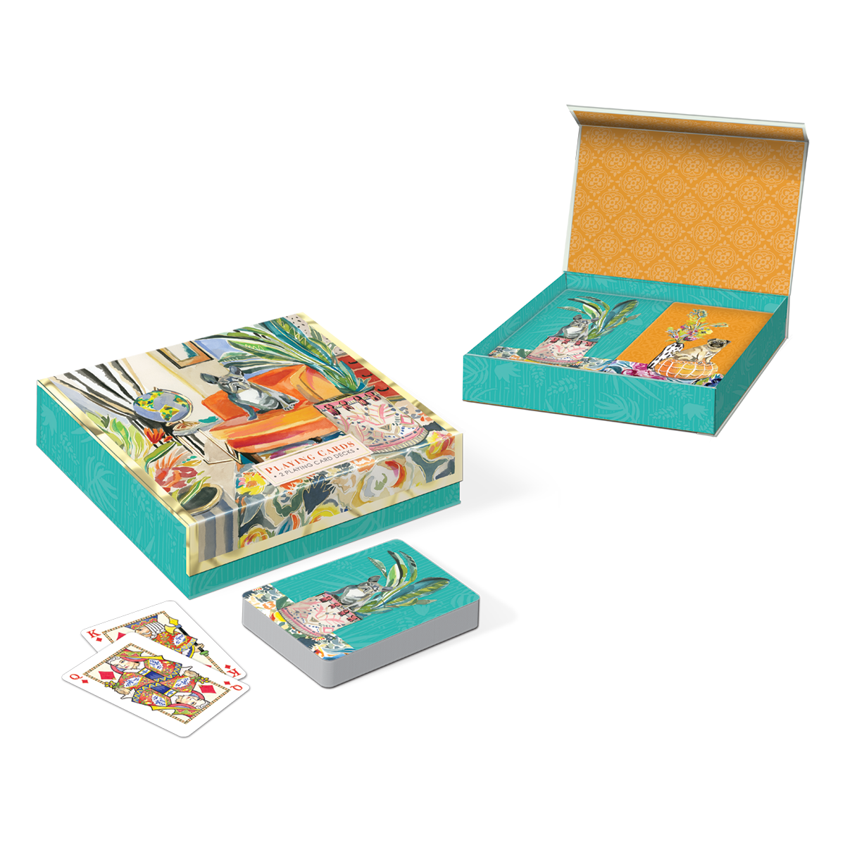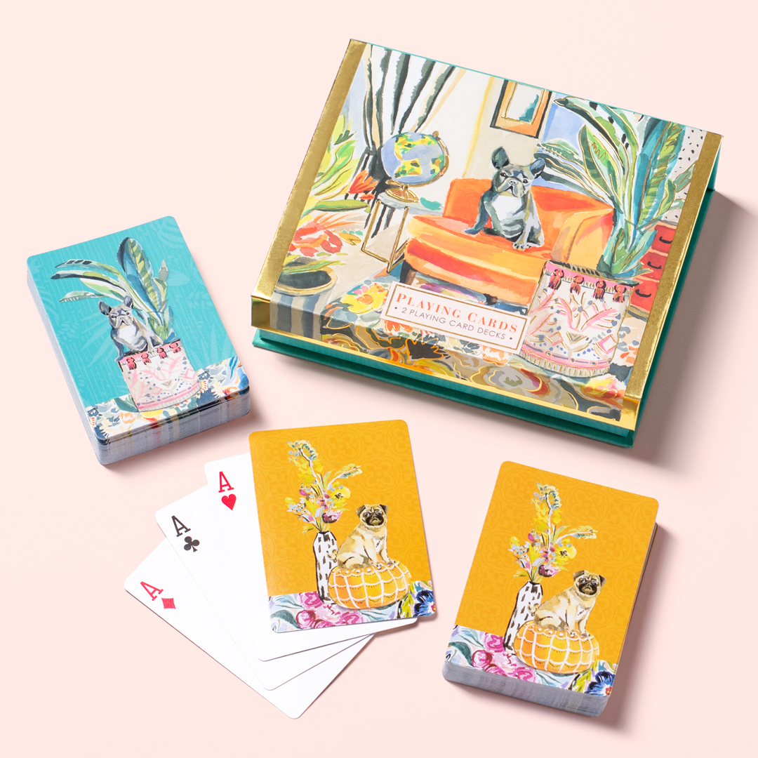 Deal, draw or discard when you play the game with the dog cards in our decorative decks. Two standard 54 card decks feature two precious pup designs in gold foiled storage box with magnetic flap closure.