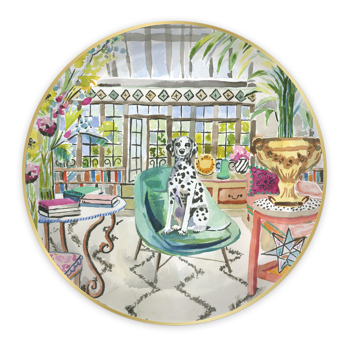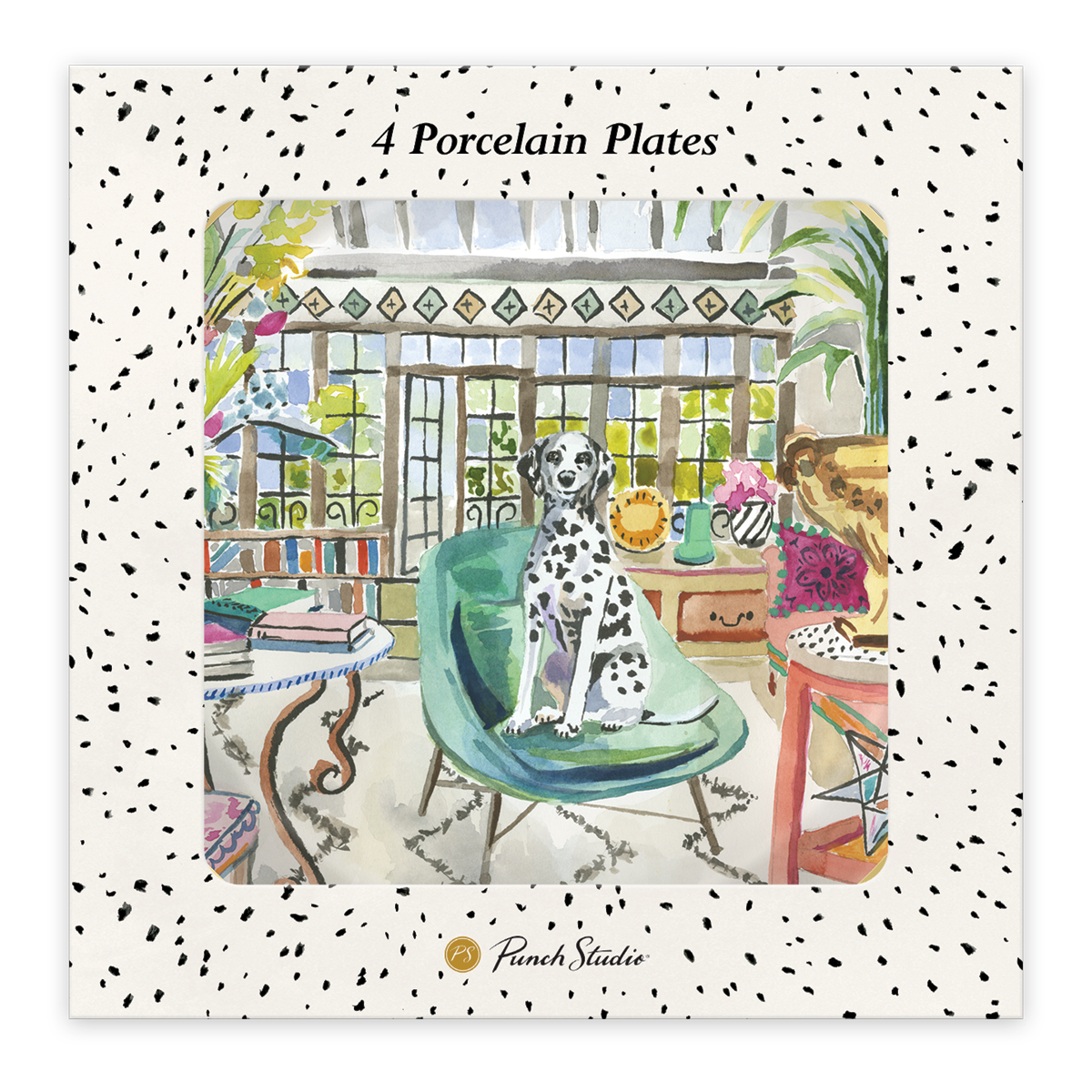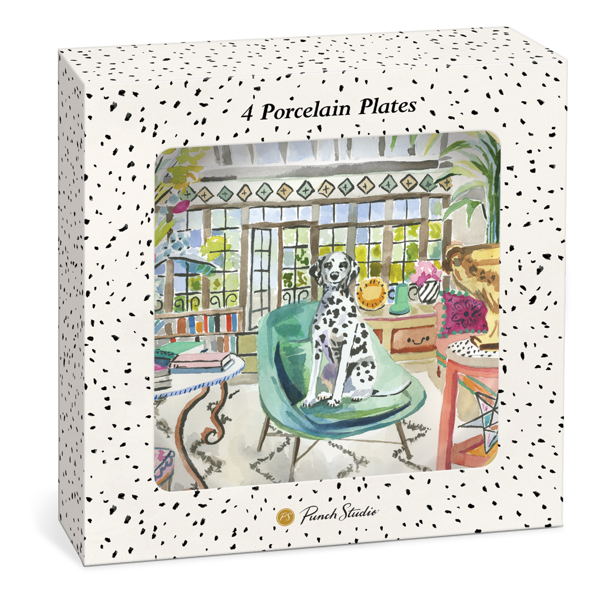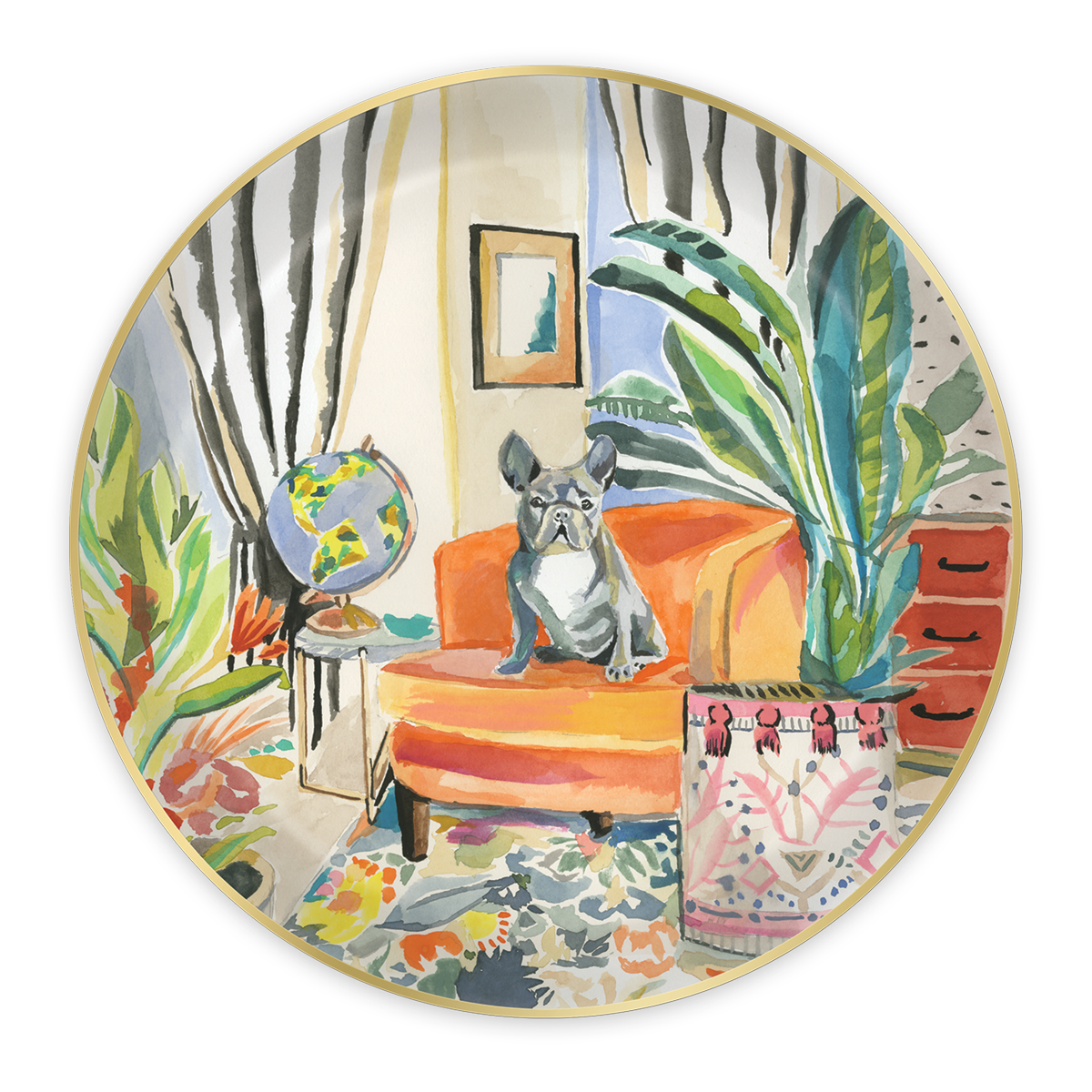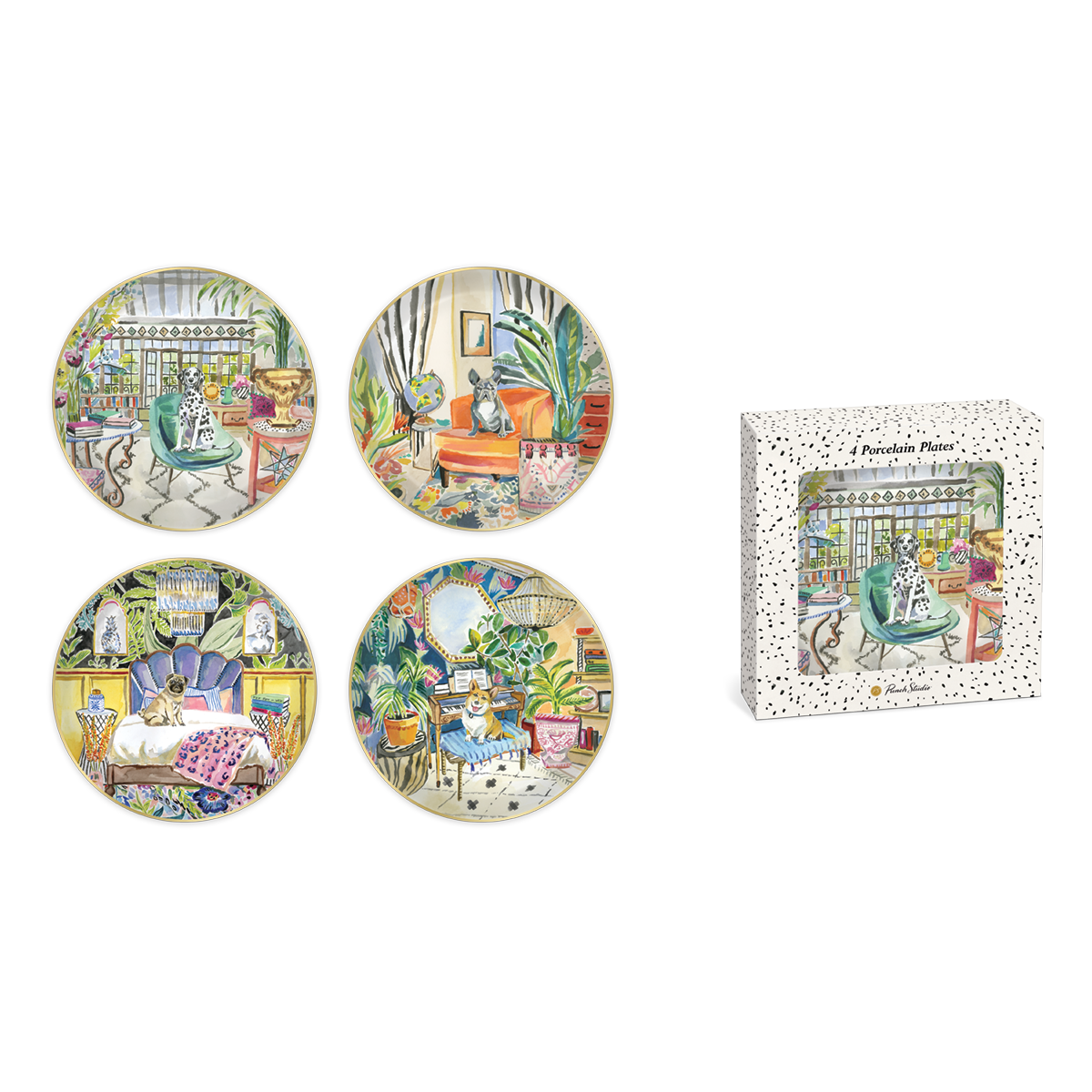 Tasteful and refined, living the life of luxury. The pooches on these impeccable plates seem to have it all! Gilded gold foil edges on standard size porcelain dinner plate. Set of four unique designs in coordinating Gift box.