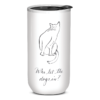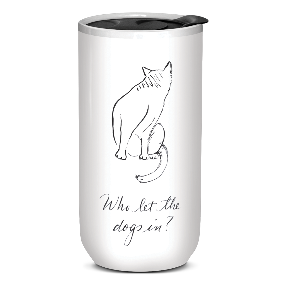Tea with a tabby or coffee with a calico. Drinks stay cold or hot in these ceramic double-walled travel mugs with removable plastic sipping lids.